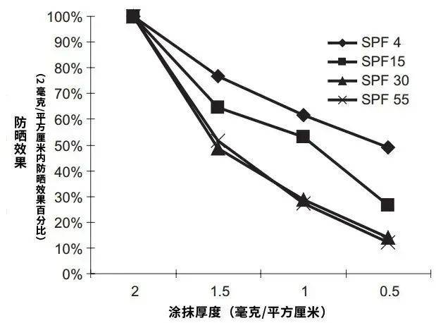 而且,如果防晒没涂够量,那防晒效果会呈指数级锐减,而不是你认为的「慢慢递减」。