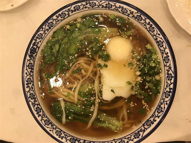 这时候我们把煮好的挂面直接放到有卤汁的碗中。就这样一碗美味可口的长寿面,已经制作成功。