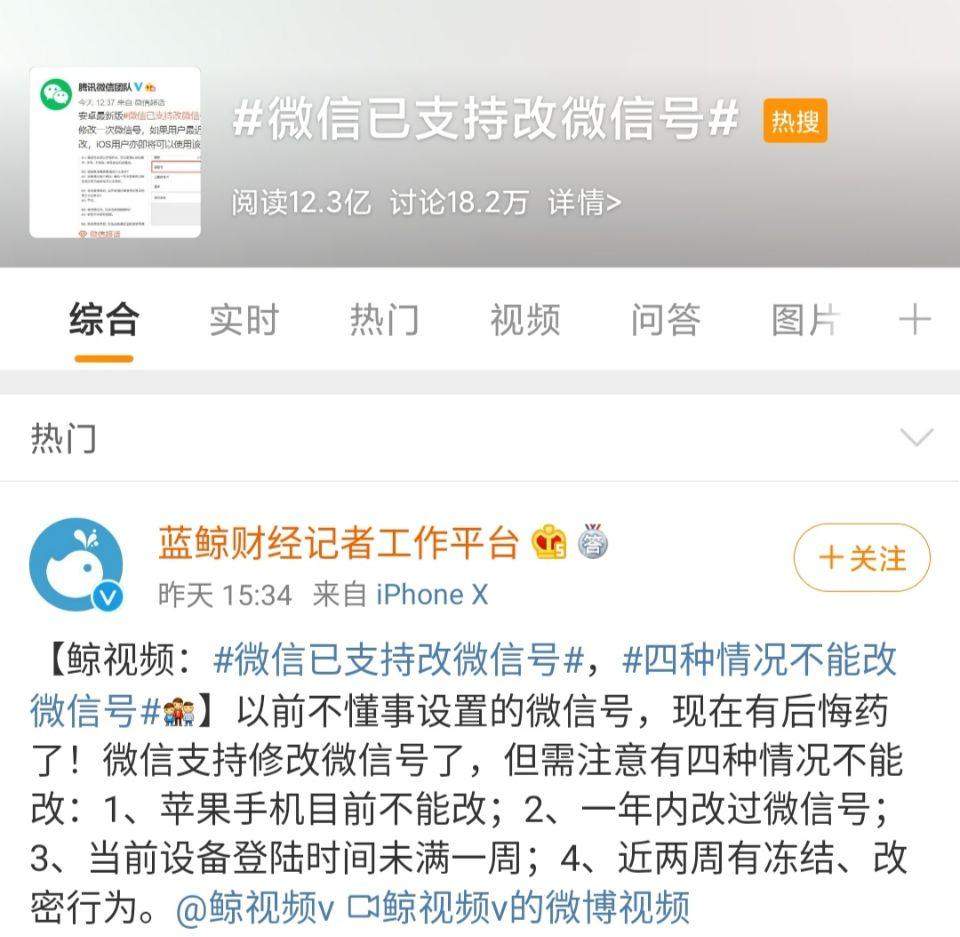 微信号支持修改后,直接登上热搜,超过12.3亿次阅读,超过18万的讨论。
