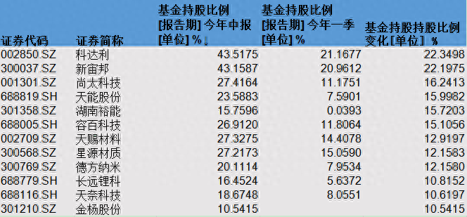 其中,科达利基金持股数量由一季度末的0.33亿股升至0.69亿股,同期新宙邦基金持股数量则由1.12亿股增加至2.32亿股。