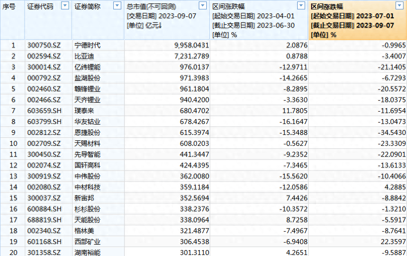 以wind锂电池板块的95家作为观察样本,7月1日至9月7日期间平均跌幅达到11.65%,其中剔除8月上市的新股盟固利后,连续两个季度下跌的个股更是多达68家,占比达到71.6%。