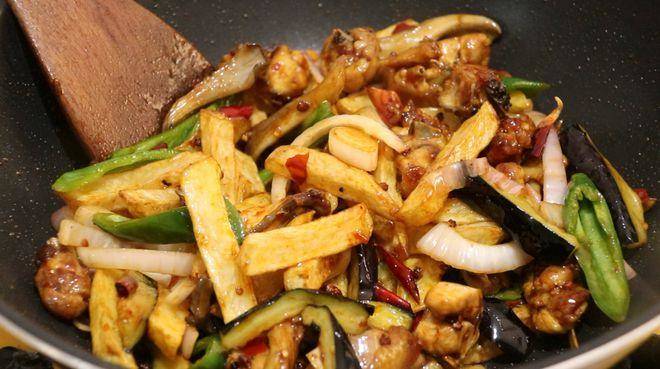 7、等到鸡块翻炒均匀之后,倒入切好的洋葱丝和青椒块,还有一些炸好的蔬菜,加入一些盐、糖和醋,大火炒匀;