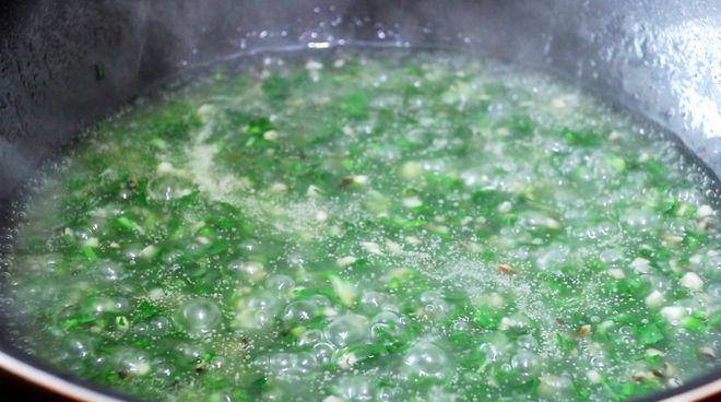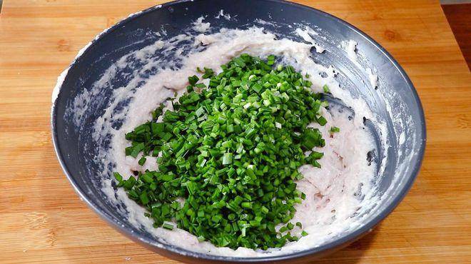 4、韭菜择去烂叶子,清洗干净,切成碎末先用油拌匀,这样就不会有水渗出来,再放入肉馅儿里面,顺着一个方向搅拌均匀,加入一些盐调味;