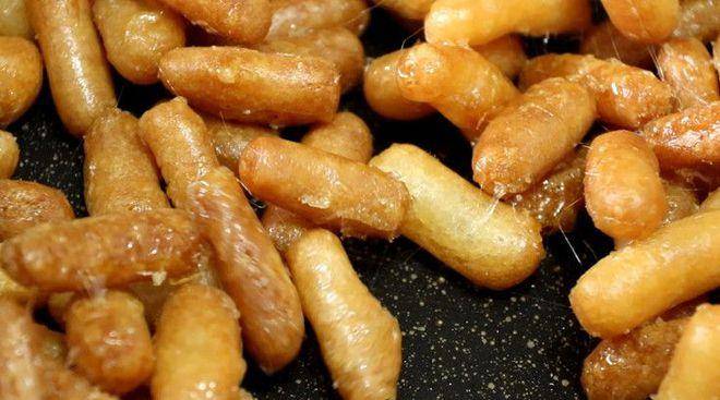 5、锅中倒入适量的油,油热将切成小段的糯米条放入进去炸,炸到糯米条漂浮起来,定型;