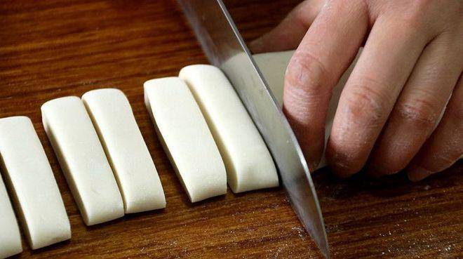 4、接着将每一根条形搓成细一点的条,再切成小段;