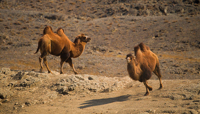 骆驼被称为“沙漠之舟”的哺乳动物。头较小,颈粗长,弯曲如鹅颈。躯体高大,体毛褐色。极能忍饥耐渴。骆驼可以在没有水的条件下生存2周,没有食物可生存一个月之久。驼峰里贮存着脂肪,可在得不到食物时,分解成身体所需养分,供骆驼生存需要。另外,骆驼的胃里有许多瓶子形状的小泡泡,用来贮存水。