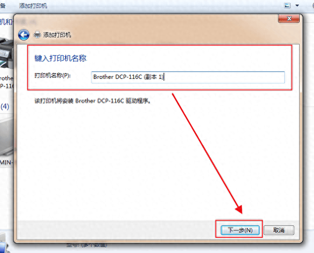 第四步:在这里只需要输入打印机的名称就可以了,输入完成后点击下一步,就会开始安装打印机。