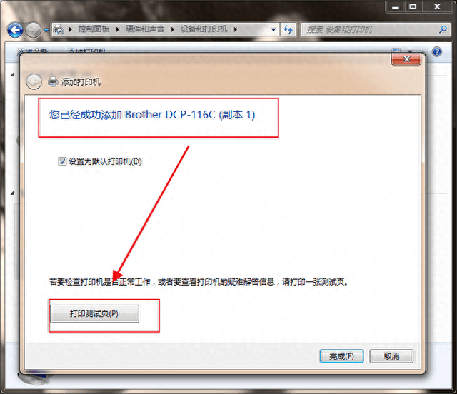 第五步:打印机安装成功后,先不要着急关闭这个窗口,点击左下角的【打印测试页】测试是否正常,如果能打开,并且能开始打印就代表安装成功。如果没有连接成功,就检查一下打印机的电源是否打开,还有就是安装的打印机型号是否正确。