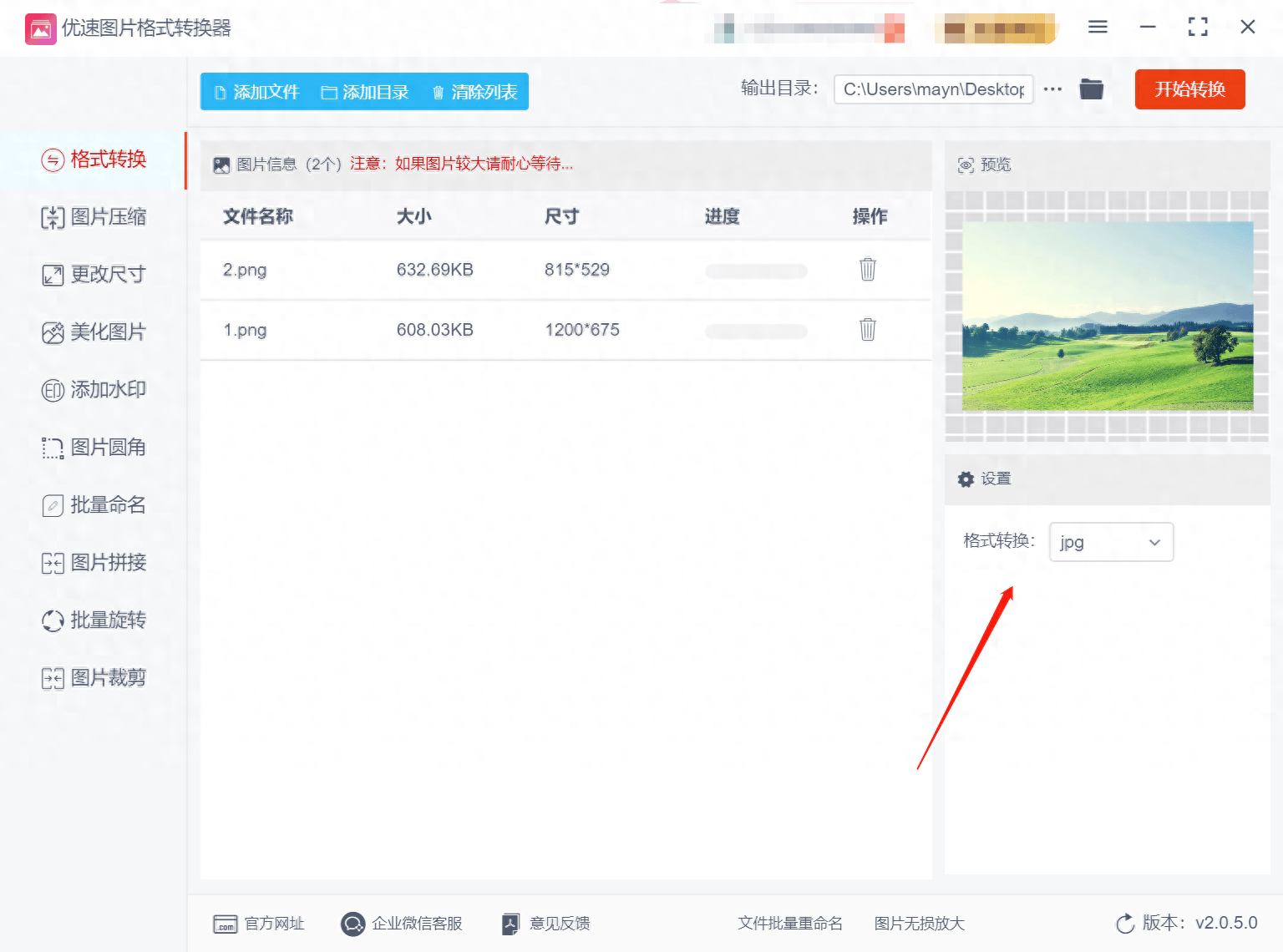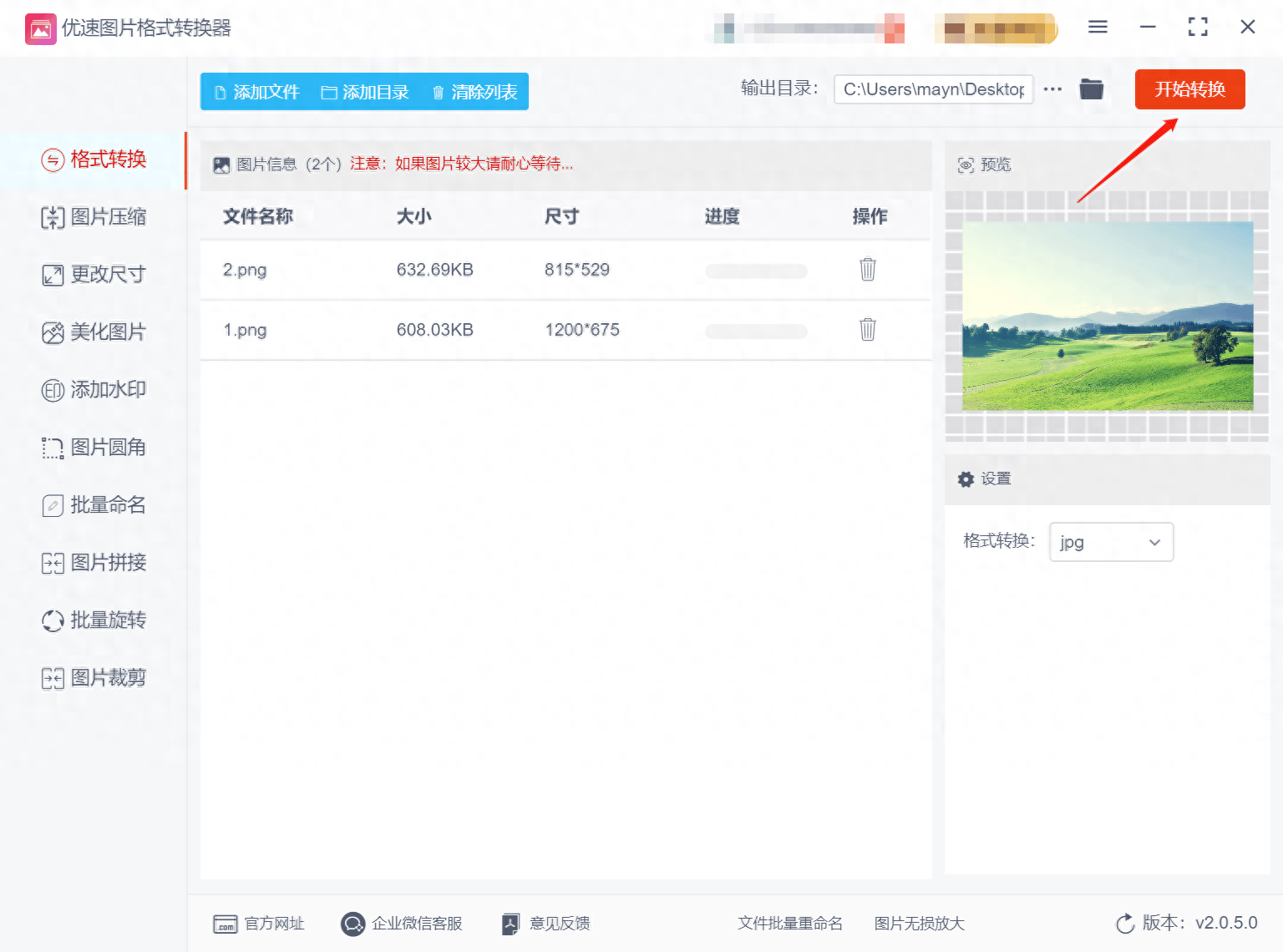步骤4、上述步骤完成后,直接点击右下角的“开始转换”按钮即可。这个时候,我们就已经将png图片转换为了jpg了。