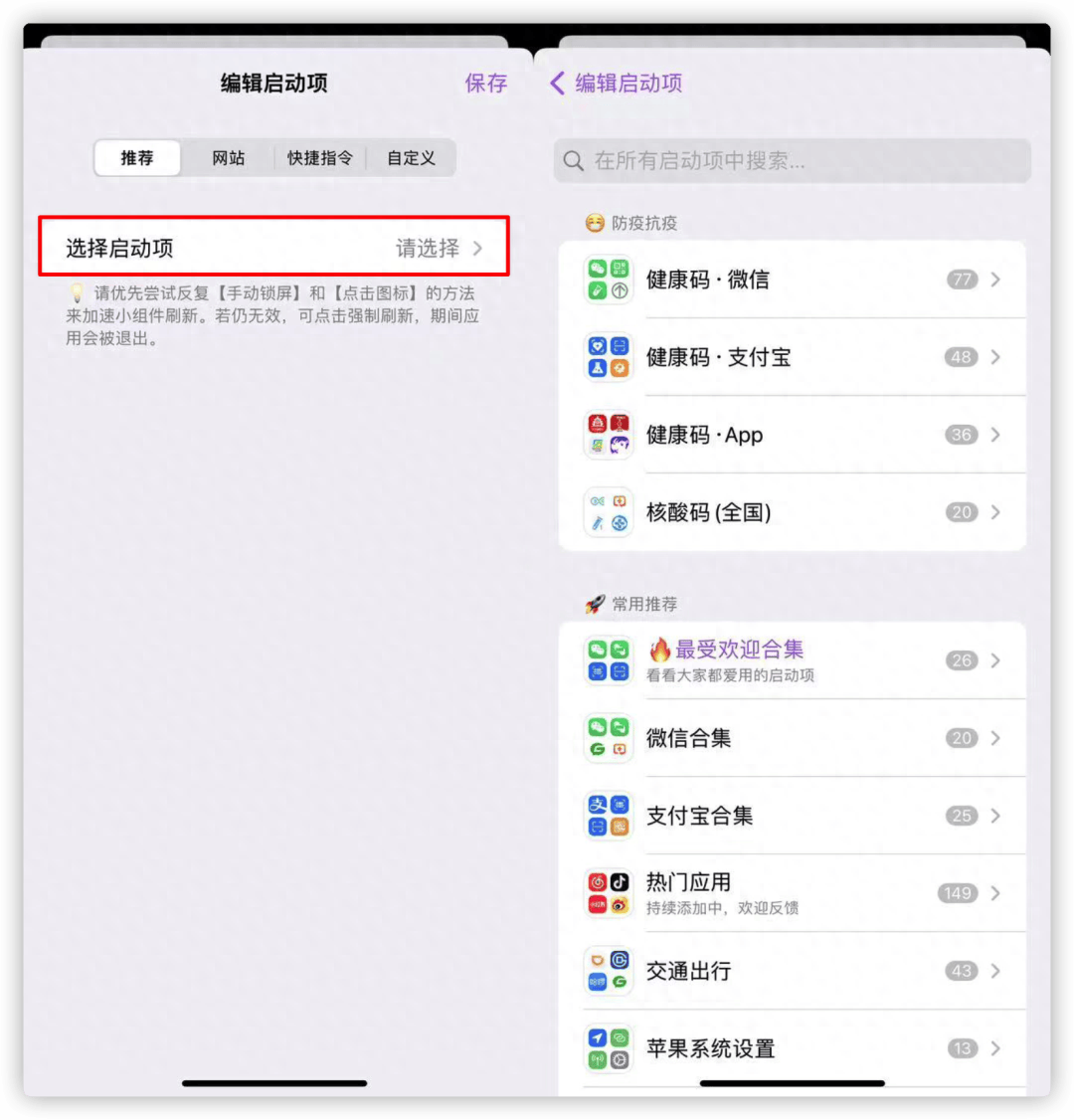 点击「添加收藏」—「选择启动项」即可新增更多 App,这里可以看到一些推荐的 App 组合。