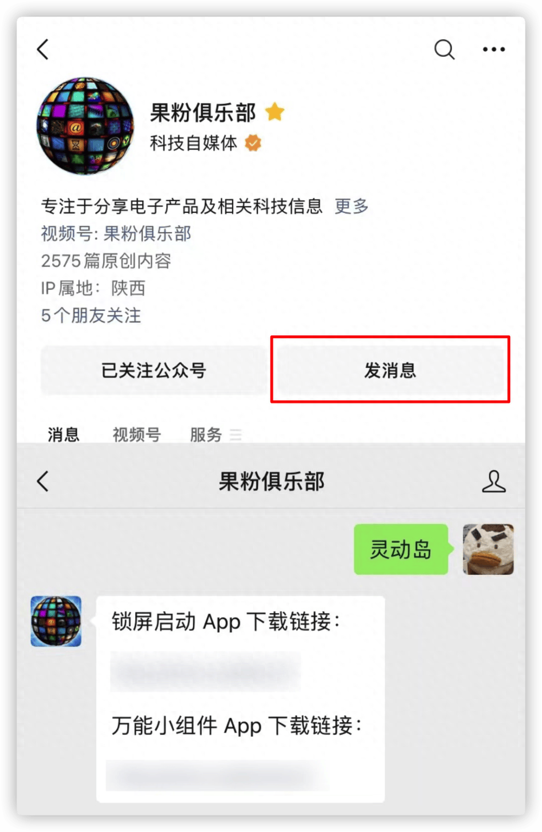 感兴趣的小伙伴可以进入果粉俱乐部公众号,点击右侧下方的「发消息」,回复关键词「灵动岛」即可获取下载链接。