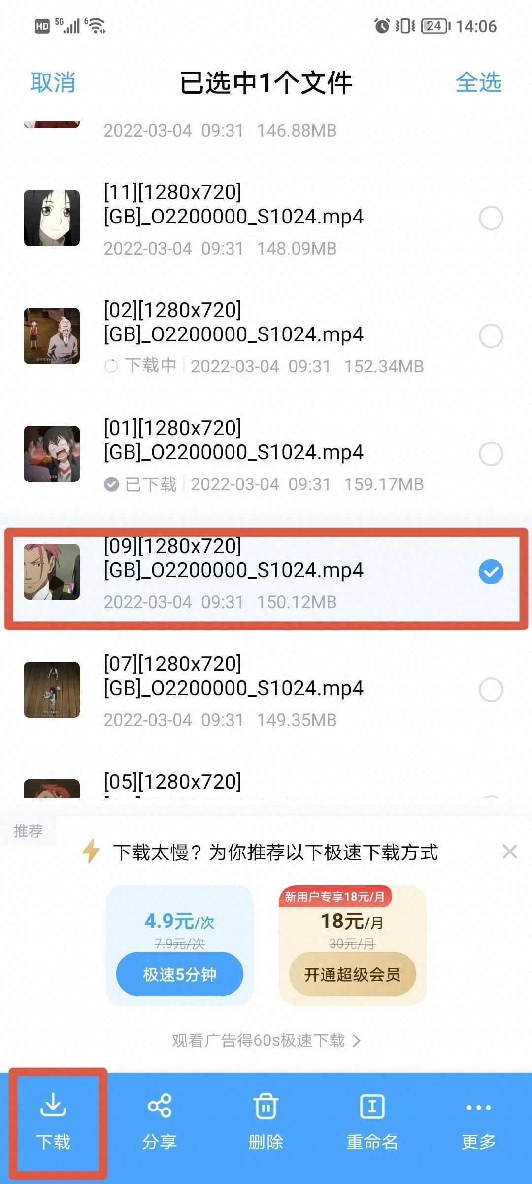 2.勾选需要保存到手机相册的视频。点击下方的下载选项,选择需要下载的清晰度。