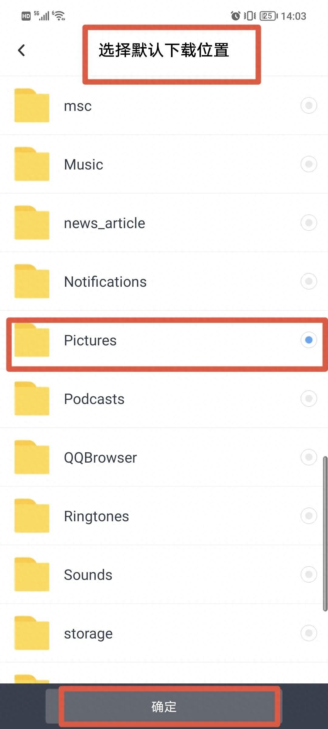 2.修改默认下载位置为Pictures,有的是Camera,点击确定。
