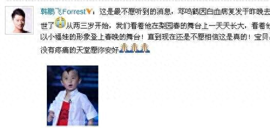 甚至还有网友说,当时在春晚舞台上看到邓鸣贺时,就觉得他白的有些不正常,但当时正是过年的喜庆日子,也不好意思跟周围的人说,后来就将这件事遗忘,再一次听到这个小男孩的消息后,就是它离世的消息……