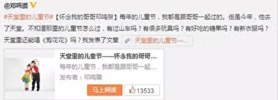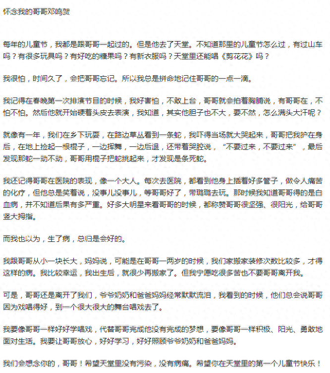 有一年的儿童节,妹妹邓鸣璐在微博上发布怀念哥哥邓鸣贺的文章,一字一句我们都能看到妹妹对哥哥的思想,一句“很怕,时间久了,会把哥哥忘记。所以我总是拼命地记住哥哥的一点一滴”瞬间让人泪崩……