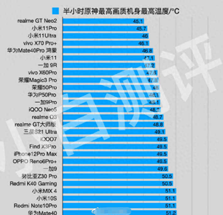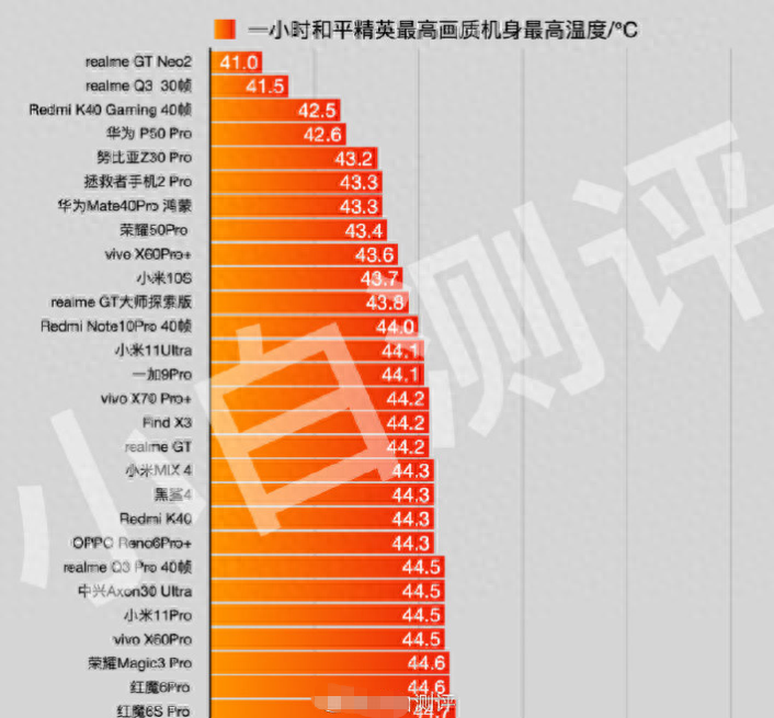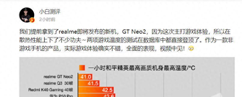 根据小白测评微博了解,realme真我GT Neo2是一款主打游戏体验的手机,在散热方面增加了不少的黑科技。而从手机运行游戏的具体表现来看,在一小时和平精英最高画质下,手机的机身温度最高仅41℃,领先华为、努比亚、荣耀、小米等多款旗舰手机。同时,在半小时原神最高画质下,realme真我GT Neo2的机身最高温度也仅45.1℃,手机散热表现超乎预期。