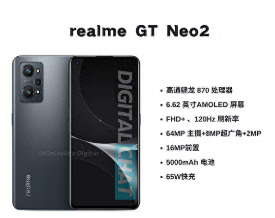 具体配置方面,根据工信部公布的型号为RMX3370的realme新机的证件照和配置参数来看,realme真我GT Neo2配置方面将会搭载高通骁龙870处理器,最高配备12GB+512GB超大存储组合。影像方面,该机或搭载前置1600万像素单摄,后置6400万+800万+200万三摄组合,支持4K视频拍摄。同时续航方面,它有可能会搭载5000mAh大电池,支持65W有线快充,但具体如何现在还不能确定。