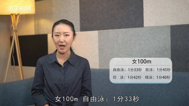 女100m:自由泳:1分33秒。蛙泳:1分45秒。仰泳:1分42秒。蝶泳:1分40秒。(三级)