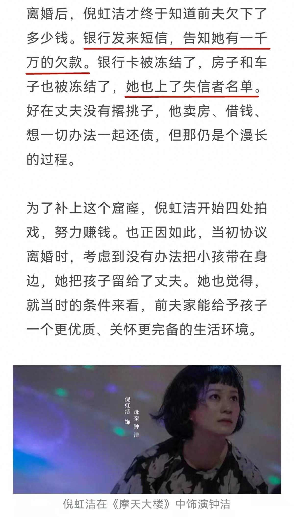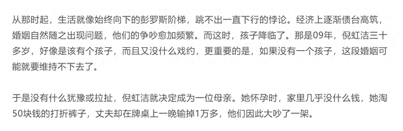 遗憾的是,孩子也没能让倪虹洁的婚姻延续太久。一次家庭聚会上,倪虹洁当着家人的面质问丈夫到底欠了多少钱,让丈夫感觉到失了面子。
