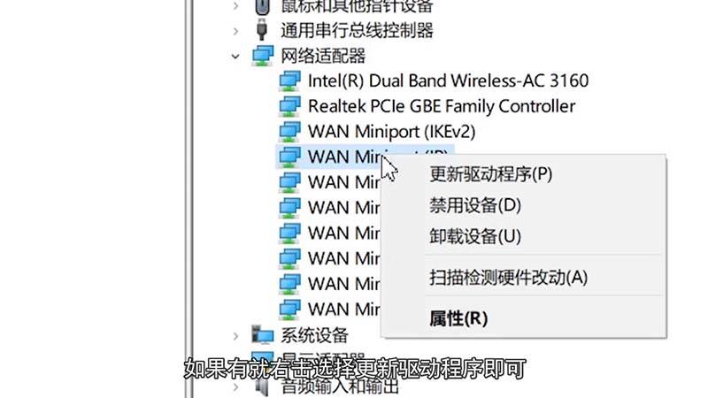 2、选择设备管理器,右侧找到网络适配器,打开后找到无线网卡设备,查看驱动有没有出现黄色的感叹号,如果有就右击选择更新驱动程序即可;