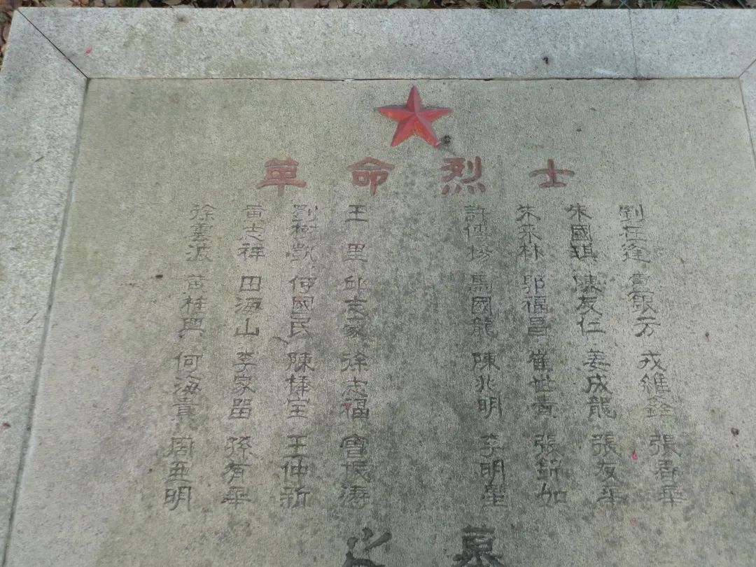 青松肃立,翠柏垂首。致悼词后,老战友们开始瞻仰烈士墓: 一个个高约一米的烈士墓碑,呈长方形,每方石碑上,工工整整地镌刻着32位烈士英名。他们虔诚地瞻仰着,仔细地辨认着,小声地议论 。他们在追忆当年悲壮激烈的战斗,他们在缅怀战友的英烈事迹,他们在寻觅烈士的英名……