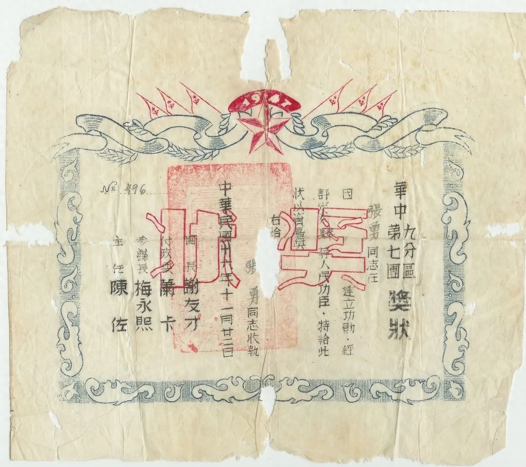 张勇烈士(1925-1949)生前荣获的《人民功臣》奖状。