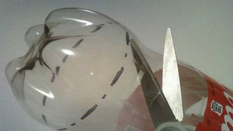 利用空挡时间,我们来制作生豆芽的容器。找个大号的空可乐瓶,用剪刀将盖子减掉,留下的部分清洗干净,然后再用针在瓶底扎出小孔,保证水能流出就可以。