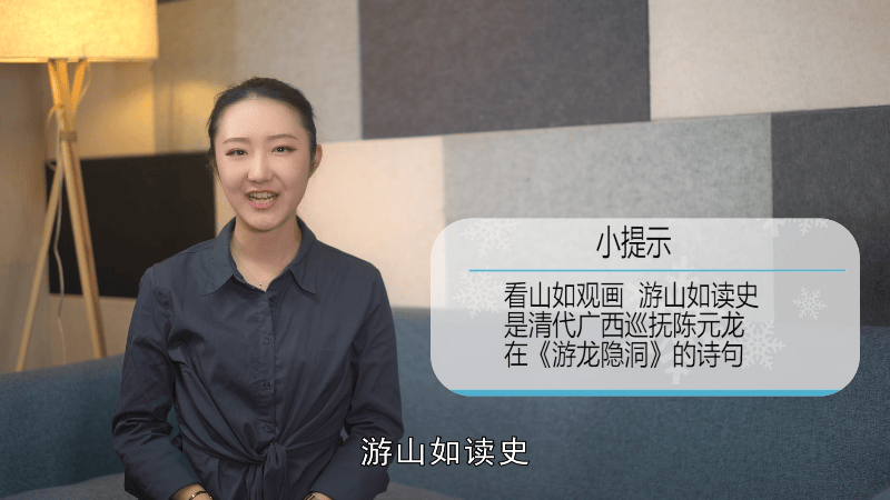 全句“看山如观画,游山如读史。”是清代广西巡抚陈元龙在《游龙隐洞》的诗句极其简练地把桂林的自然景观与人文景观高度概括了出来。他所生发感慨的地方位于市七星公园月牙山西南麓,这里就是桂海碑林博物馆管辖下的龙隐岩龙隐洞,“摩崖殆遍,壁无完石”,是桂林摩崖石刻最为集中,展示桂林石刻文化的一个重要地方,可谓摩崖石刻形式之史书。