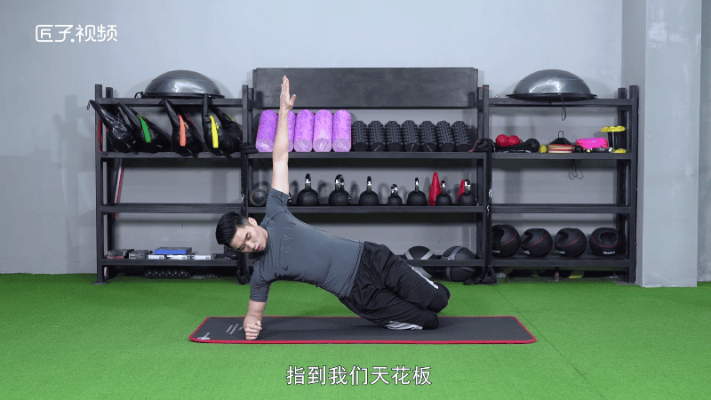 屈膝侧卧,手肘撑住,臀部抬起,腹部收紧,然后手往上,指到我们天花板,保持上半身一条直线,控制。