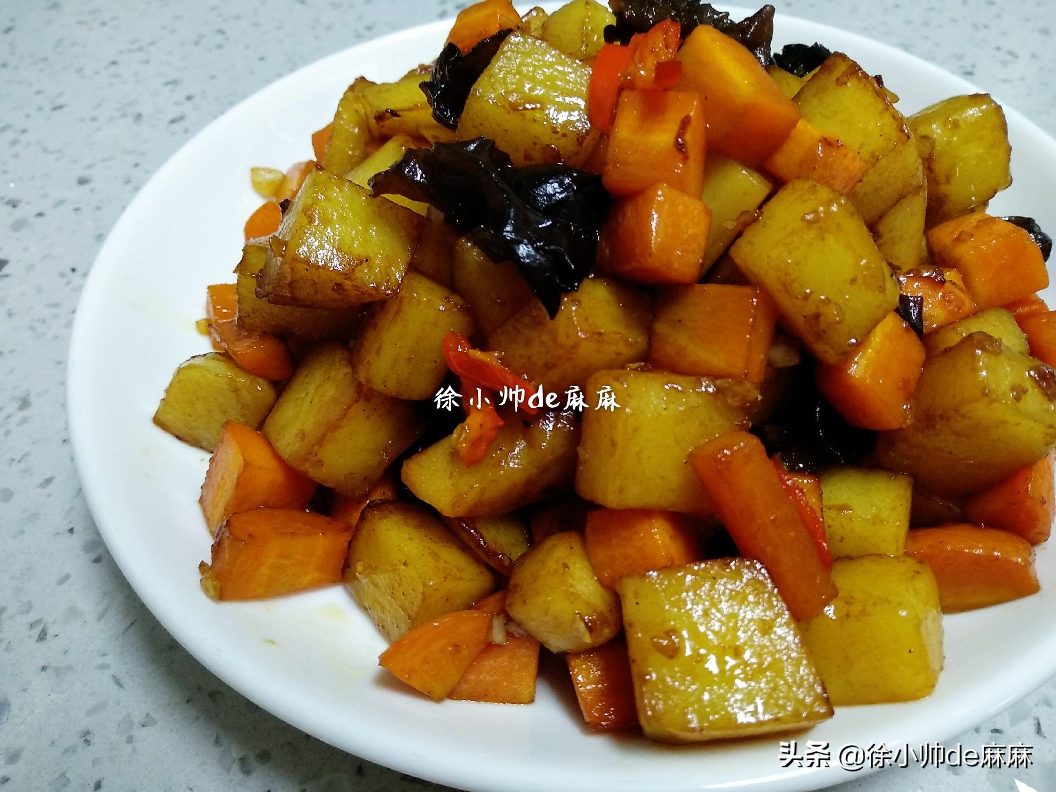 3、然后将胡萝卜块和木耳放进去,添加佐料:生抽、老抽、盐、胡椒粉、糖,将佐料和土豆胡萝卜翻炒均匀。继续中小火,将土豆和胡萝卜继续煎一下。看到胡萝卜变色了,将蒜泥和小米辣放进去,快速翻炒均匀即可。