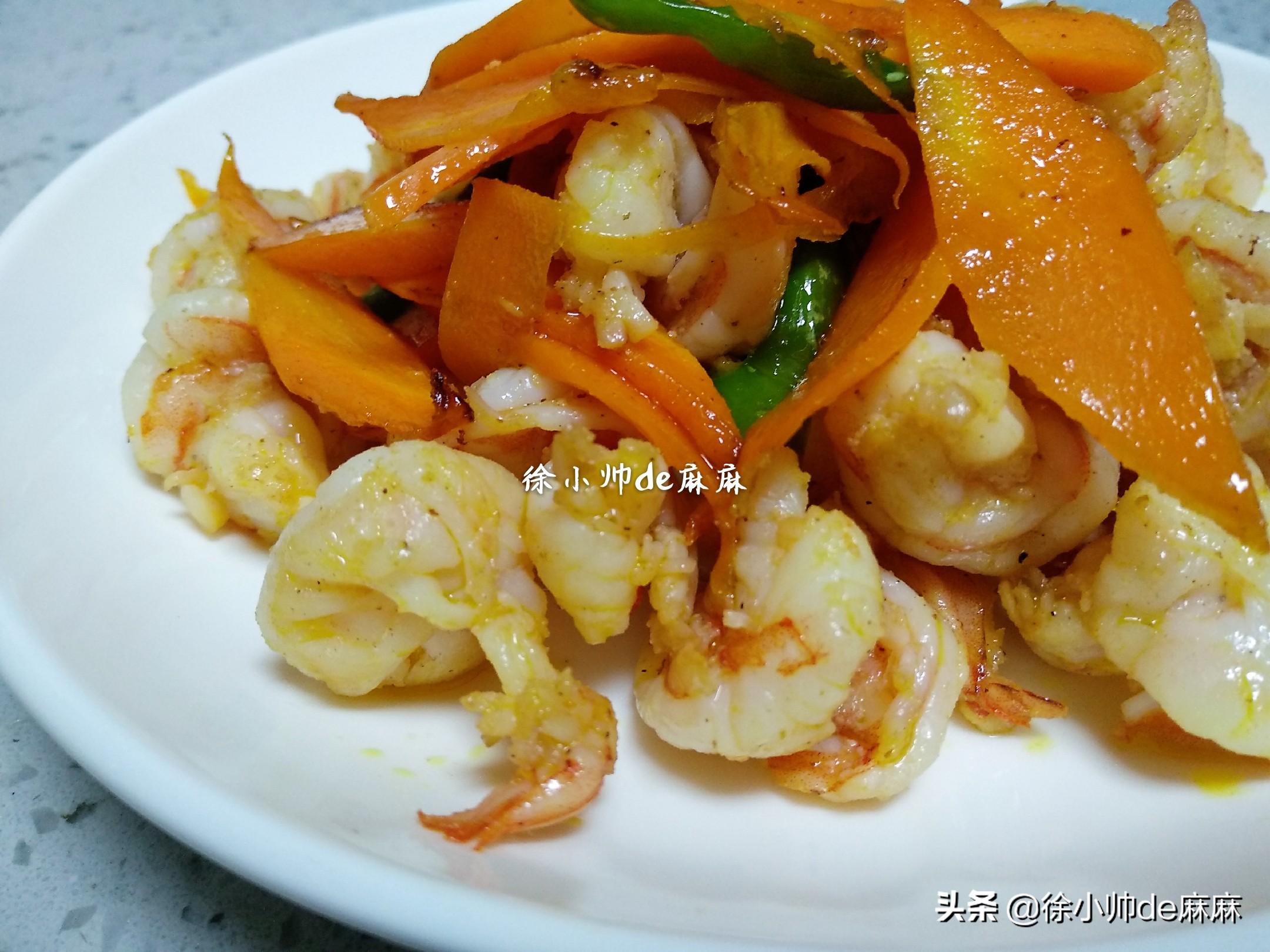 3、热锅热油先将青辣椒、蒜粒、姜片放进去煸炒出香味。再将虾仁放进去翻炒变色,单独装起。锅内再倒入少许油,放入胡萝卜,加盐翻炒变色,再将虾仁放入和胡萝卜翻炒均匀即可。