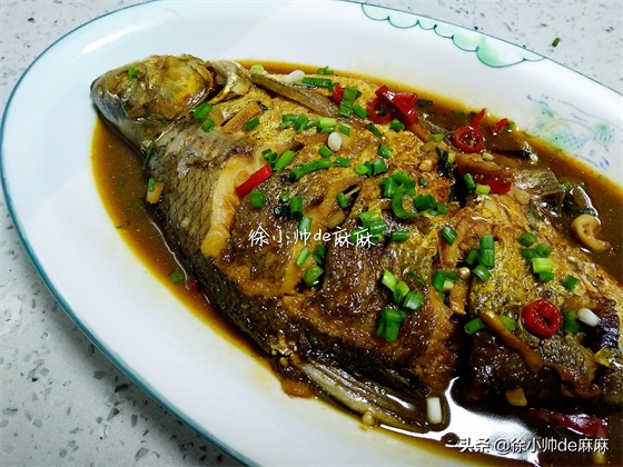 3、倒入没过鱼身的热水,放入小米辣碎、生姜丝、蒜粒,添加作料:老抽、生抽、白酒、糖、醋,大火煮开,小火焖煮20分钟。看到汤汁明显变少,撒入香葱碎,装碟即可。