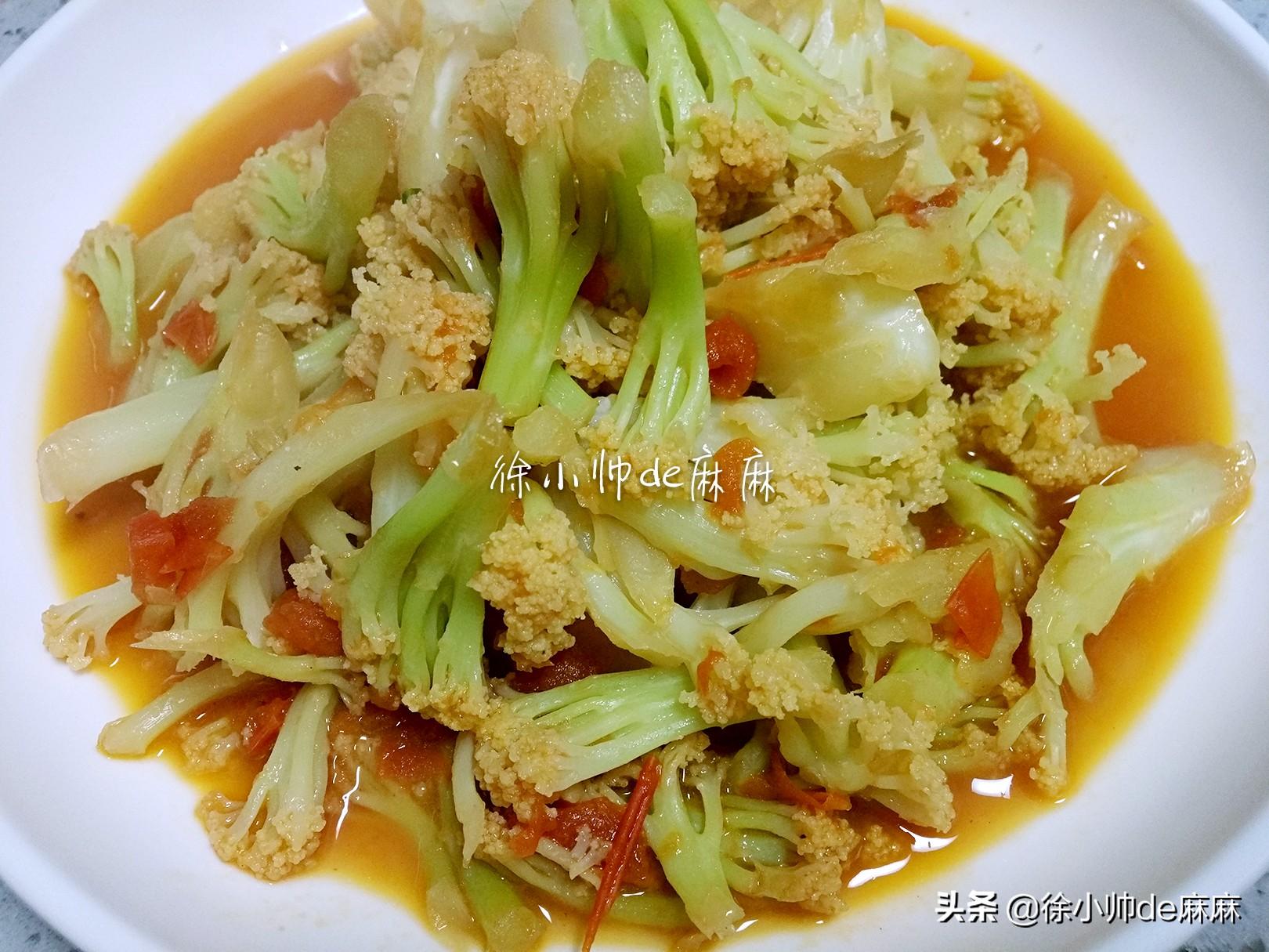 1、食材准备:花菜用剪刀剪成小块,清洗沥干水;西红柿一个洗净去皮切小块备用。