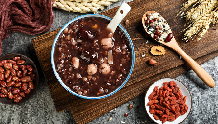 腊八粥中的豆类富含蛋白质、膳食纤维、维生素和矿物质,赖氨酸含量也很丰富,与大米等谷物搭配起来可形成有效的营养互补。同时,适当添加坚果类和干制果蔬类食材,不仅可以丰富营养,还可以调节口味。