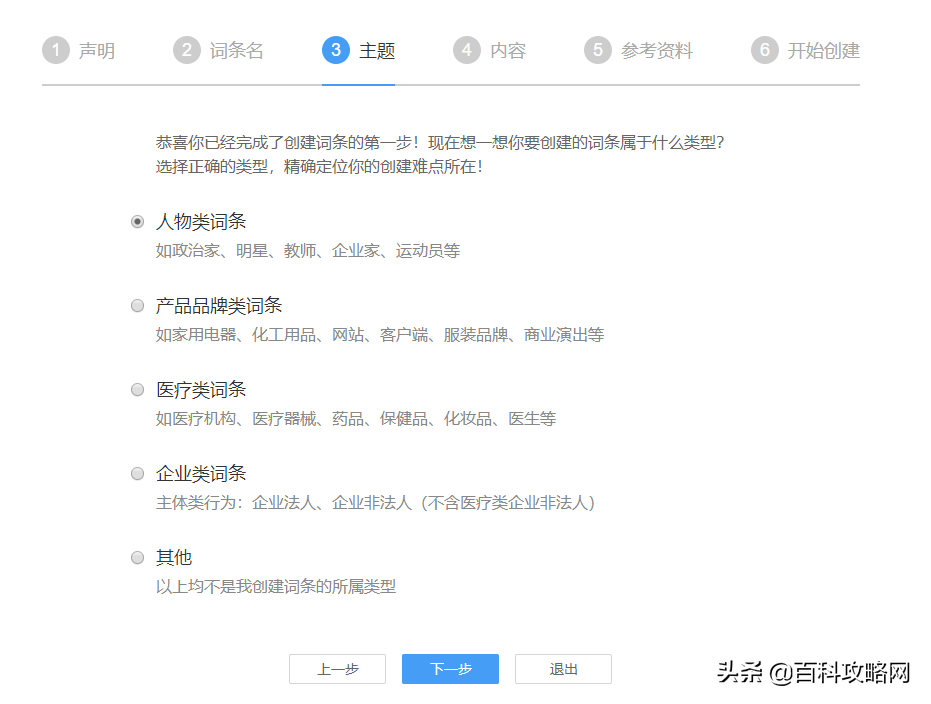 这里主要讲你需要创建的词条分类,选择你想创建的分类即可,如果里面没有你想创建的分类可以选其他。
