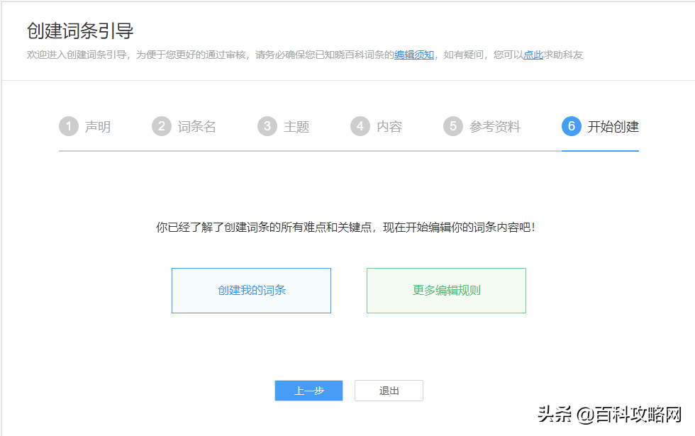 就进入了正式创建页面,如果你了解上面的规则后,你直接点百科资深用户,无需引导直接编写也会进入这个页面,如下图: