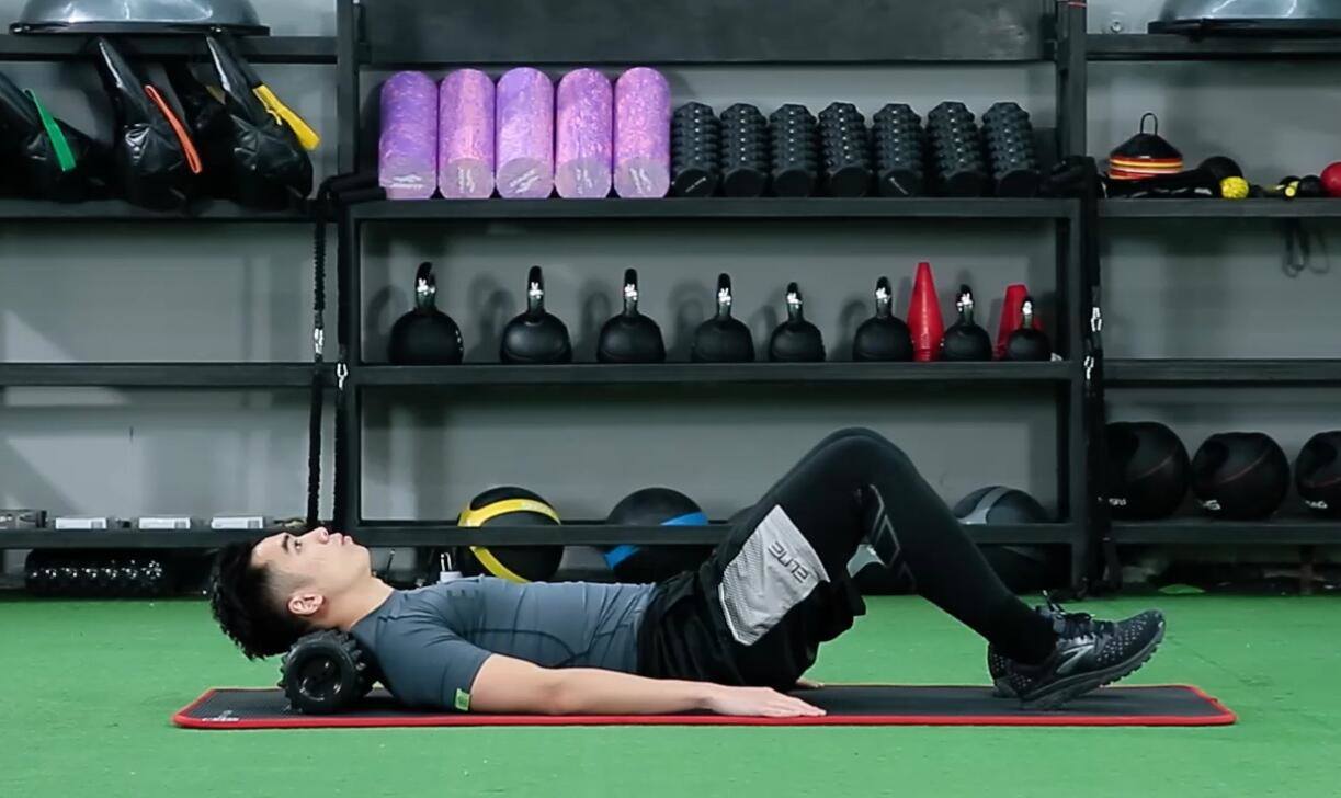 首先仰卧在瑜伽垫上,将泡沫轴置于颈部下方,缓慢转动颈部。