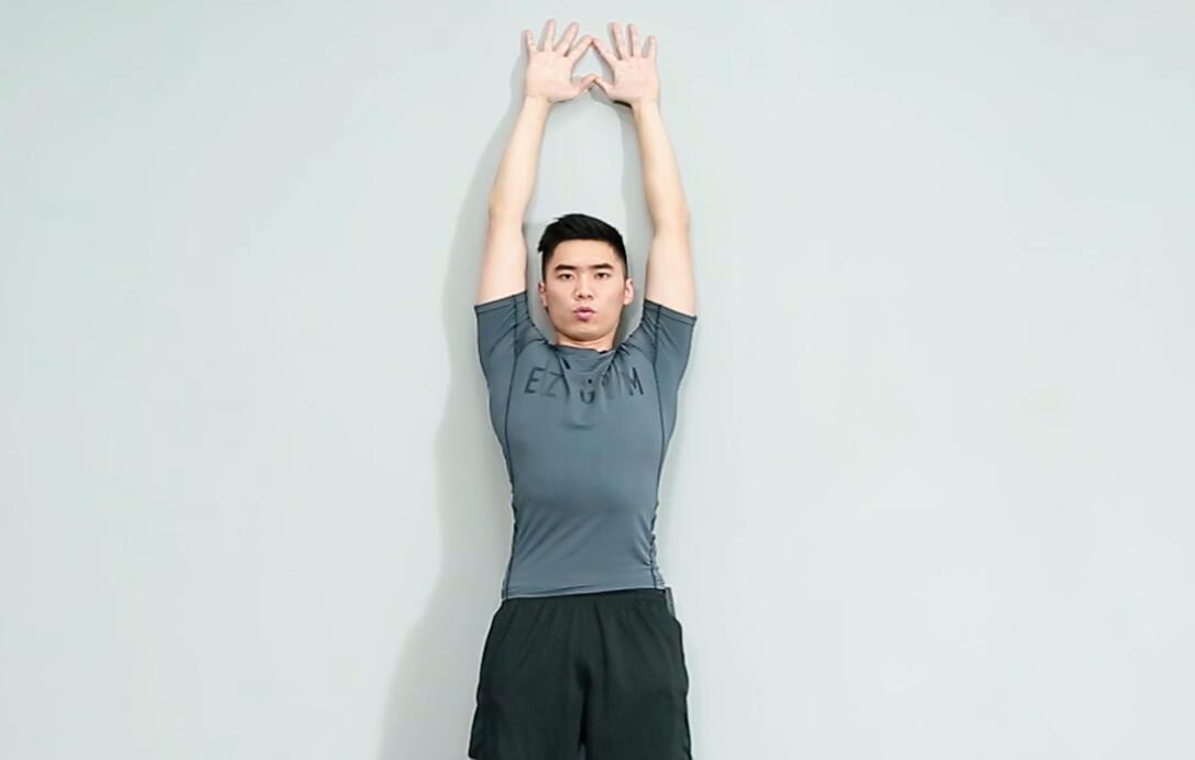 首先靠于墙面,脚后跟距离墙面半个脚掌,下颚微收收紧腹部,双手平行于地面上下移动。