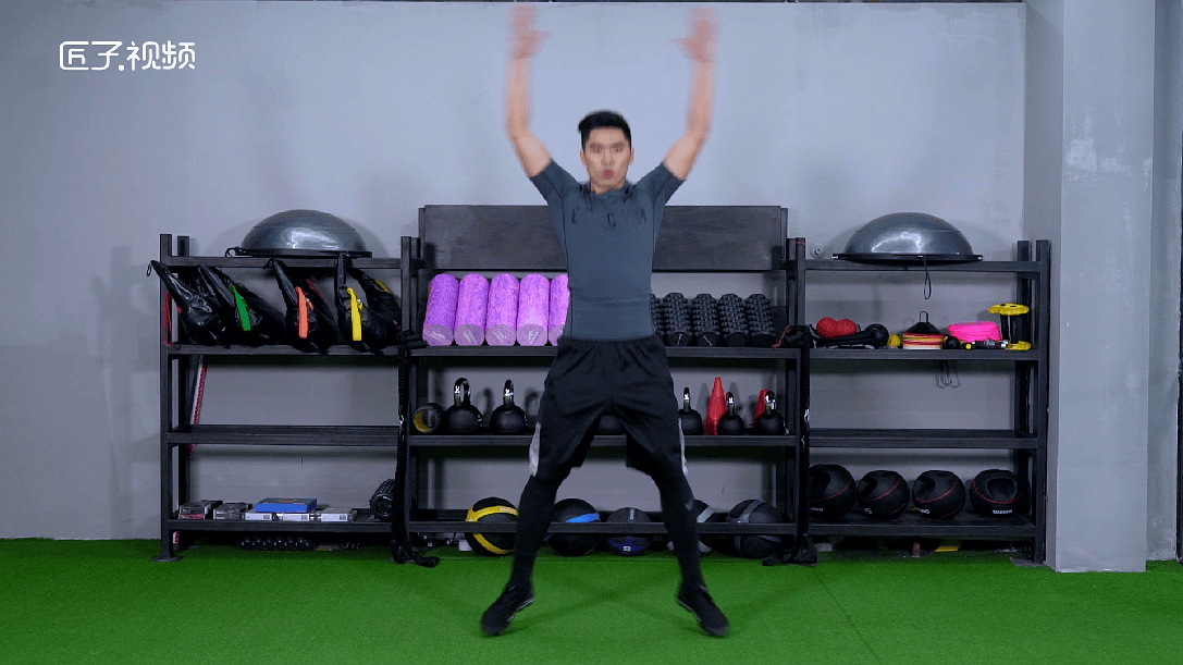 双腿并拢,在跳的时候同时打开,又同时并拢,双手朝地面呈平行状态,往上击掌,往下到水平;