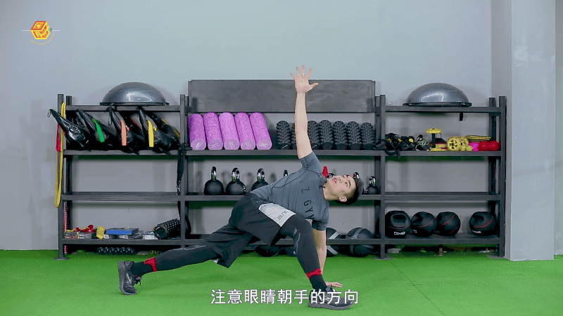 保持俯卧撑的准备姿势,右腿抬到我们右手外侧,抬起右手手肘往下旋转,然后往外打开,注意眼睛朝手的方向,落下,脚回去。