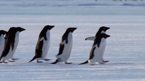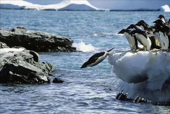等到了三月份,阿德利企鹅就会带着宝宝下海,下海也是一个技术活,毕竟不知道海豹在哪个角落里等着自己。