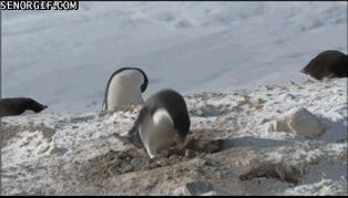 但是吧,阿德里企鹅是群居的,在北极想找那么多石头,还是很有难度的,最主要的是在,旁边搭好的窝里面就有石头,为什么要舍近求远呢?所以有一些企鹅直接从邻居家偷。