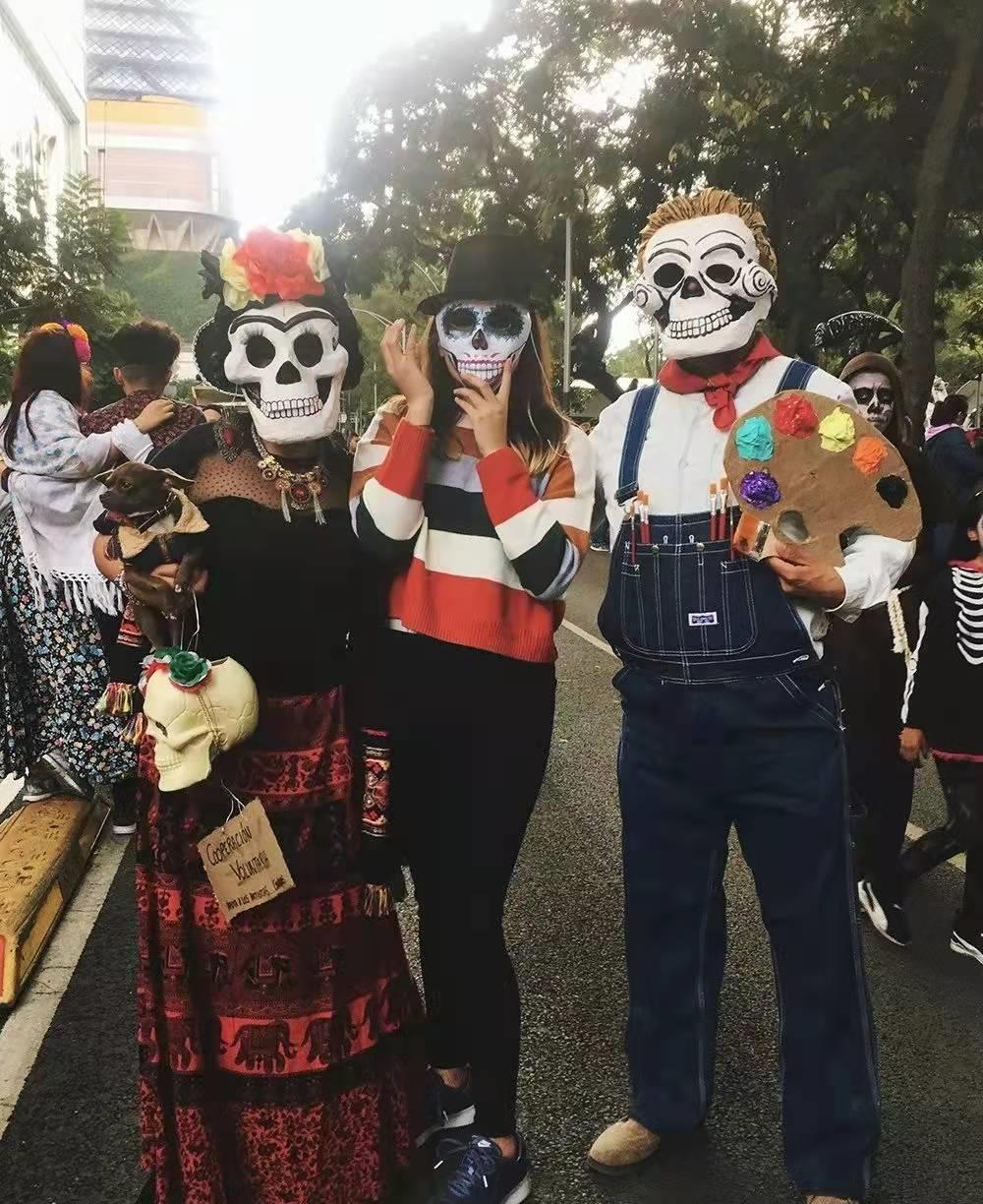 街上的人们带上骷髅头的面具,女性还会在头上戴一朵黄红相间的花束。人们为了能看到街上的游行表演,爬上树梢,甚至还会坐在交通信号灯上面。