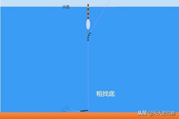 粗找底是调漂的第一步,这一步是不能省略的。粗找底的目的首先是确定下水深,为半水调漂的深度做好准备,其次就是在钓点周围试试周边的水深情况,看看是否有比较大的落差。