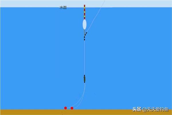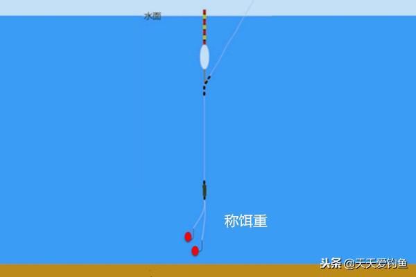 假如说上面半水空钩调的6目,挂双饵后发现浮漂没了,那你钓几目下饵肯定是到底的,如果饵太重,双饵都是到底的。假如说挂双饵后浮漂露出2目,那说明双饵重量是4目。