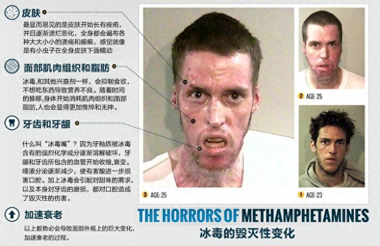 当然有一些极端的,例如液体冰毒采用注射方式吸毒(欧美见多),皮肤病就更为严重了。实际很多吸毒者都会患上皮肤病,特别是吸毒时间久的患者,皮肤病变也越明显。会造成皮肤发痒,引起黄黑色斑,面部痘痘,毛囊炎等等一系列皮肤问题!