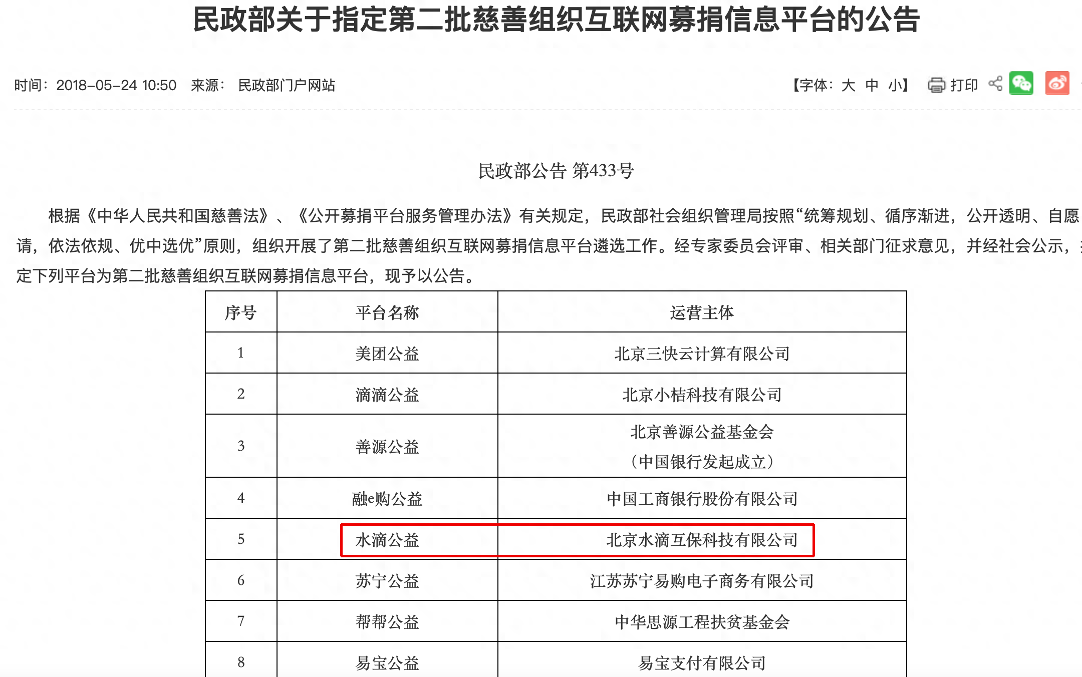 记者查询发现,早在2018年5月,民政部发布的《关于指定第二批慈善组织互联网募捐信息平台的公告》中,北京水滴互保科技有限公司的“水滴公益”就位列其中。