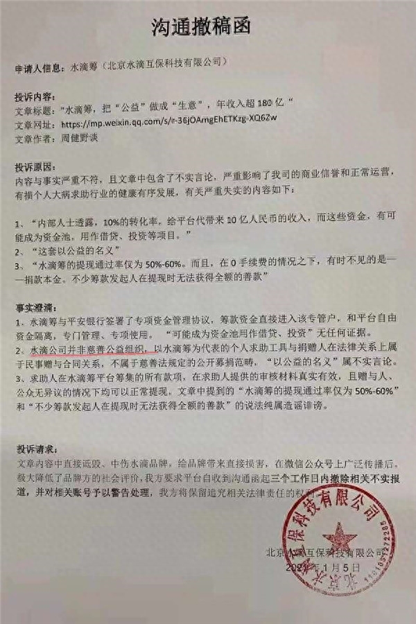 流传于社交网络中的图片显示,该沟通撤稿函由北京水滴互保科技有限公司名义发出,盖有公章,撤稿函投诉一篇名为《水滴筹,把“公益”做成“生意”,年收入超180亿》的稿件,涉及账号为微信公众号“周健野谈”。