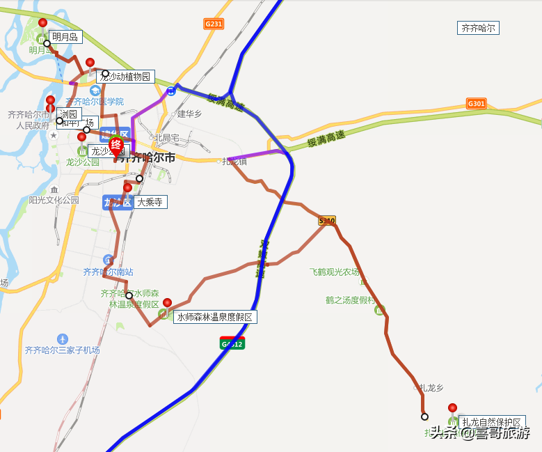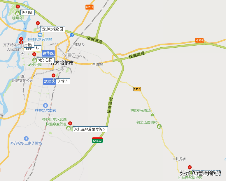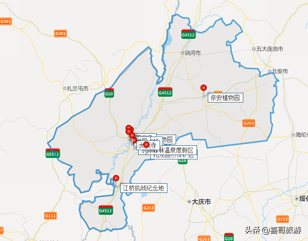 2、十大景点自驾游行程路线:齐齐哈尔-龙沙公园-和平广场-浏园-龙沙动植物园-明月岛-大乘寺-齐齐哈尔水师森林温泉度假区-扎龙自然保护区-江桥抗战纪念地-依安植物园-齐齐哈尔。