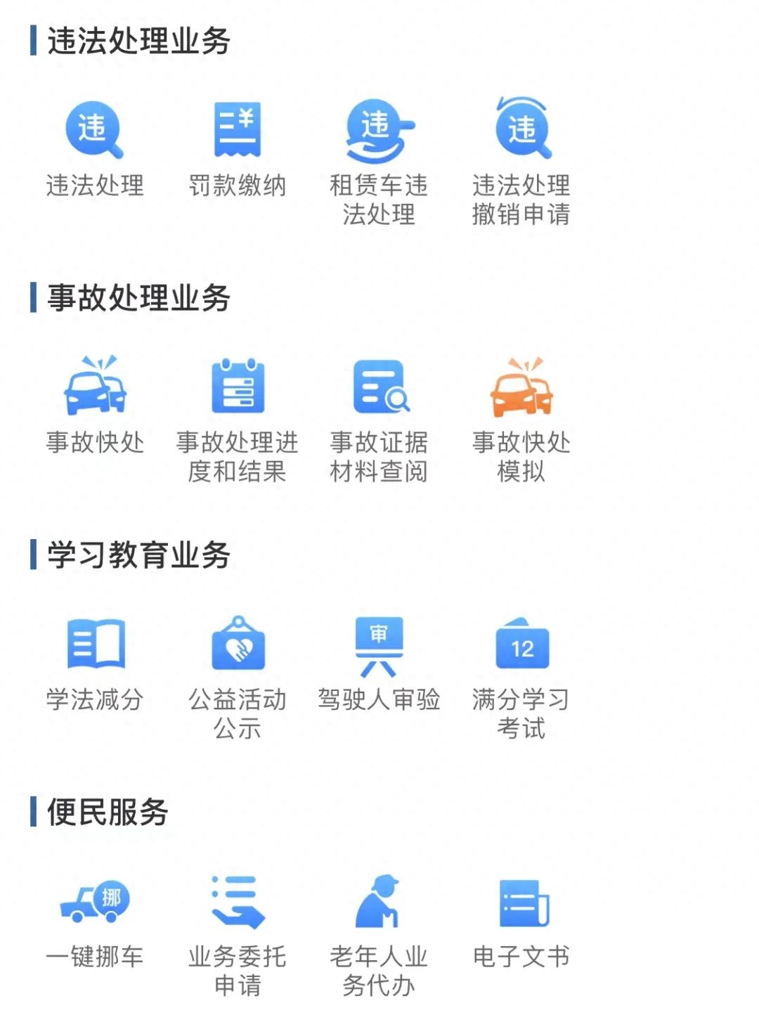 违法处理、罚款缴纳、学法减分、驾驶人审验、满分学习考试等。